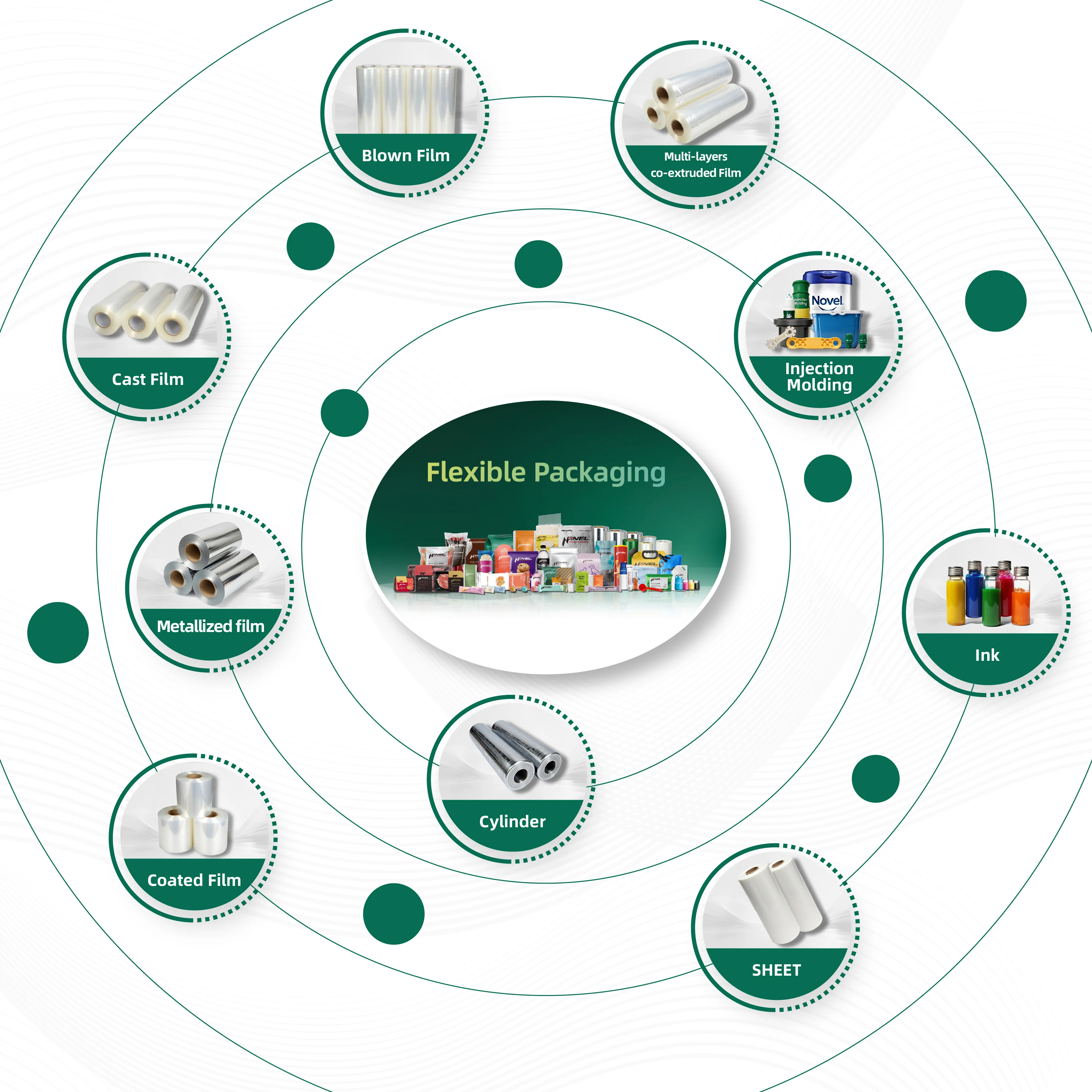 Covers the entire flexible packaging value chain. We provide base films, inks, laminates, packaging products and model injections.